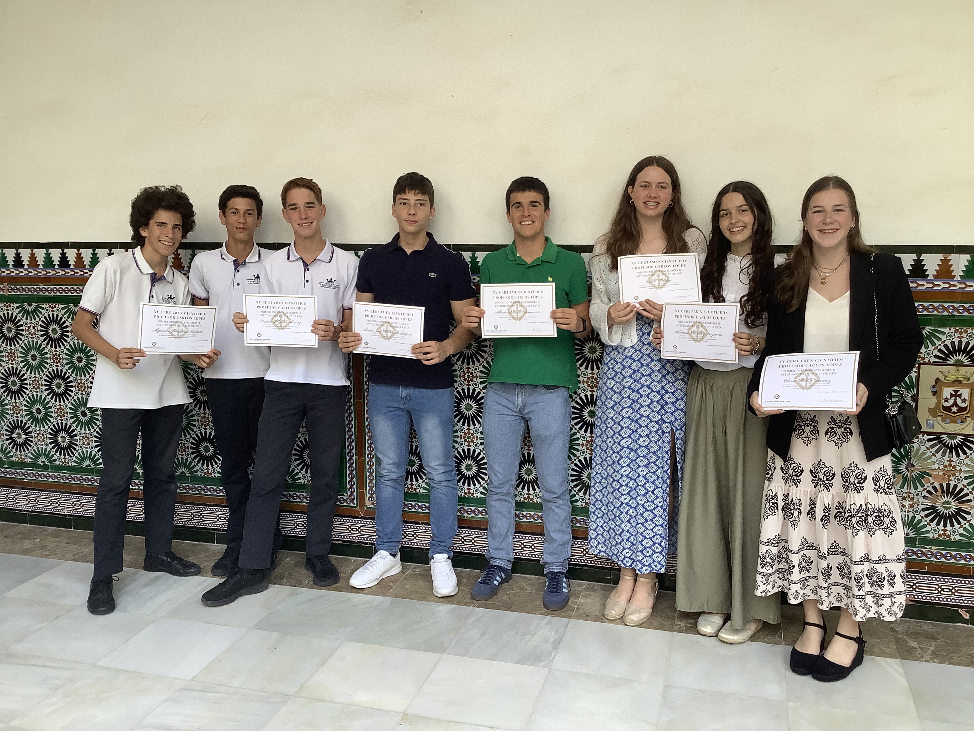 En la entrega de premios del XV Certamen Científico Profesor Carlos López a la que acudimos ayer nos encontramos con grandes noticias, ya que nuestros alumnos obtuvieron dos primeros premios y un segundo. Así, el proyecto titulado “EFECTOS DEL ABONO EN EL CRECIMIENTO DE LAS PLANTAS”, de nuestros alumnos de Y9 Antonio Zambrano García, Daniel Delgado Álvarez y Alejandro Junquera Navarro ganaron el primer premio de la categoría A (alumnos de 1º o 2º ESO). El proyecto titulado “¿CÓMO AFECTAN LAS BEBIDAS CARBONATADAS, TANTO CON AZÚCAR COMO SIN AZÚCAR, ¿AL PH Y LOS NIVELES DE AZÚCAR EN LA SALIVA?, ¿Y ES EL CEPILLADO DENTAL EFECTIVO EN PREVENIR EL IMPACTO NEGATIVO DE ESTAS BEBIDAS EN LA SALUD DENTAL?”, de nuestras alumnas de Y11 Adriana González Trigueros, Claire Deisley, Clara Muñoz Lecaroz se llevaron el primer premio de la categoría B (alumnos de 3º y 4º ESO). Por último, el proyecto titulado “¿CÓMO AFECTAN DIFERENTES DOSIS DE ASPIRINA A LA GERMINACIÓN, CRECIMIENTO Y BIENESTAR DE LA LENTEJA PARDIÑA “LENS CULINARIS?” de los alumnos de Lower Sixth Alberto Romero Benavente, Álvaro José Macías Rodríguez obtuvieron el 2º premio en la categoría C (alumnos de Bachillerato).